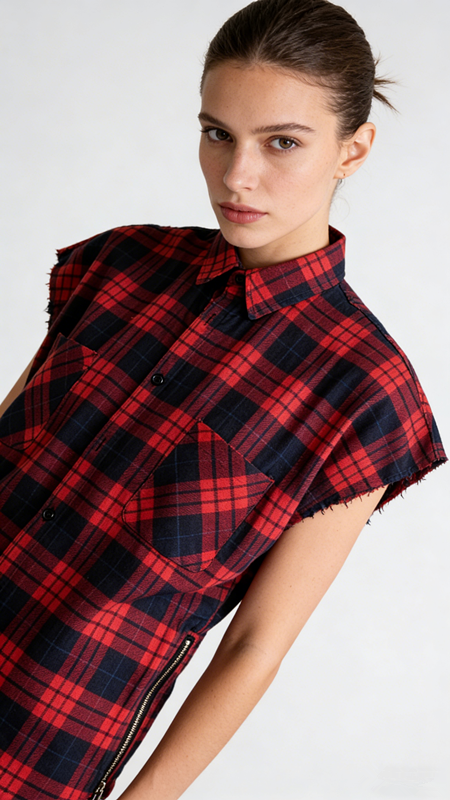 夏季侃爷高街红格法兰绒开叉拉链宽松男无袖衬衫 比伯衬衣潮
